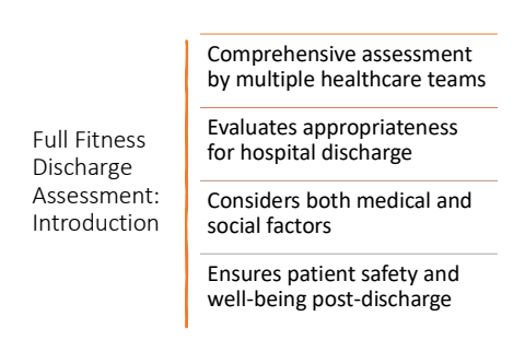 Full Fitness Discharge Assessment: IntroductionComprehensive assessment by multiple healthcare teamsEvaluates appropriateness for hospital dischargeConsiders both medical and social factorsEnsures patient safety and well-being post-discharge