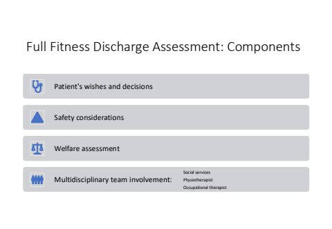 Full Fitness Discharge Assessment: ComponentsPatient's wishes and decisionsSafety considerationsWelfare assessmentMultidisciplinary team involvement:Social servicesPhysiotherapistOccupational therapist