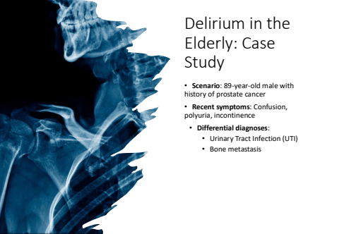 Delirium in the Elderly: Case Study%u2022 Scenario: 89-year-old male with history of prostate cancer%u2022 Recent symptoms: Confusion, polyuria, incontinence%u2022 Differential diagnoses:%u2022 Urinary Tract Infection (UTI)%u2022 Bone metastasis