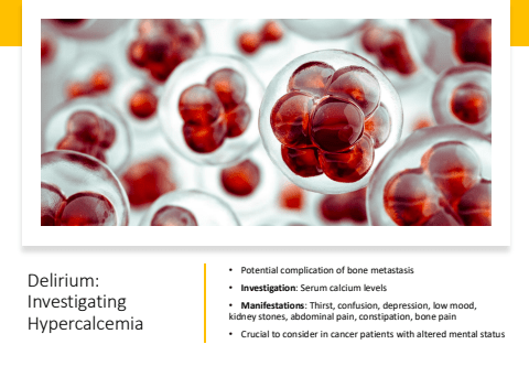 Delirium: Investigating Hypercalcemia%u2022 Potential complication of bone metastasis%u2022 Investigation: Serum calcium levels%u2022 Manifestations: Thirst, confusion, depression, low mood, kidney stones, abdominal pain, constipation, bone pain%u2022 Crucial to consider in cancer patients with altered mental status