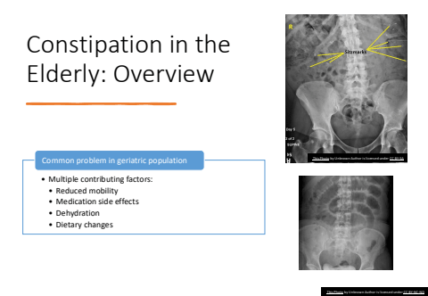 Constipation in the Elderly: Overview%u2022 Multiple contributing factors:%u2022 Reduced mobility%u2022 Medication side effects%u2022 Dehydration%u2022 Dietary changesCommon problem in geriatric populationThis Photo by Unknown Author is licensed under CC BY-NC-NDThis Photo by Unknown Author is licensed under CC BY-SA