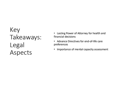 Key Takeaways: Legal Aspects%u2022 Lasting Power of Attorney for health and financial decisions%u2022 Advance Directives for end-of-life care preferences%u2022 Importance of mental capacity assessment