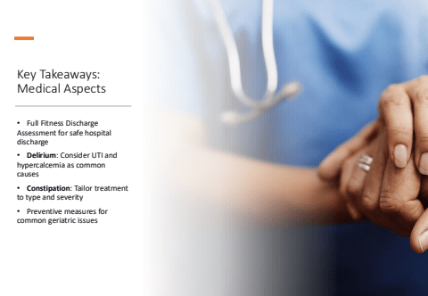 Key Takeaways: Medical Aspects%u2022 Full Fitness Discharge Assessment for safe hospital discharge%u2022 Delirium: Consider UTI and hypercalcemia as common causes%u2022 Constipation: Tailor treatment to type and severity%u2022 Preventive measures for common geriatric issues