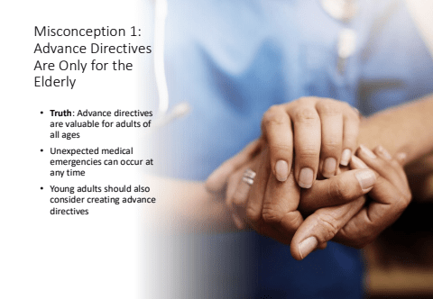 Misconception 1: Advance Directives Are Only for the Elderly%u2022 Truth: Advance directives are valuable for adults of all ages%u2022 Unexpected medical emergencies can occur at any time%u2022 Young adults should also consider creating advance directives