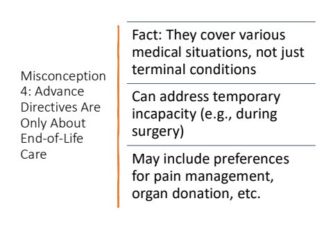 Misconception 4: Advance Directives Are Only About End-of-Life CareFact: They cover various medical situations, not just terminal conditionsCan address temporary incapacity (e.g., during surgery)May include preferences for pain management, organ donation, etc.