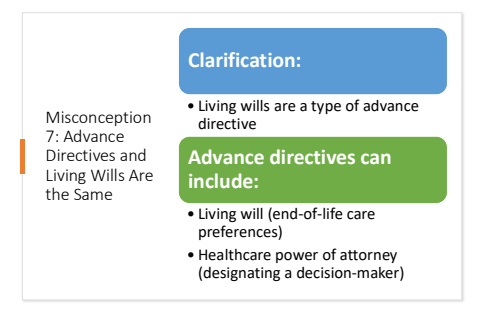 Misconception 7: Advance Directives and Living Wills Are the SameClarification:%u2022 Living wills are a type of advance directiveAdvance directives can include:%u2022 Living will (end-of-life care preferences)%u2022 Healthcare power of attorney (designating a decision-maker)