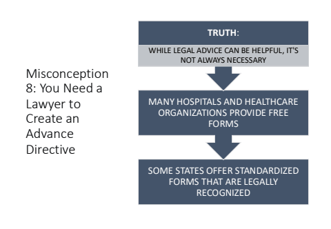 Misconception 8: You Need a Lawyer to Create an Advance DirectiveSOME STATES OFFER STANDARDIZED FORMS THAT ARE LEGALLY RECOGNIZEDMANY HOSPITALS AND HEALTHCARE ORGANIZATIONS PROVIDE FREE FORMSTRUTH:WHILE LEGAL ADVICE CAN BE HELPFUL, IT'S NOT ALWAYS NECESSARY