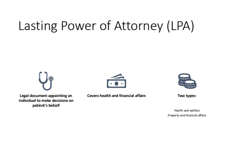 Lasting Power of Attorney (LPA)Legal document appointing an individual to make decisions on patient's behalfCovers health and financial affairs Two types:Health and welfareProperty and financial affairs