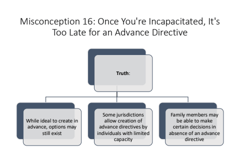 Misconception 16: Once You're Incapacitated, It's Too Late for an Advance DirectiveTruth:While ideal to create in advance, options may still existSome jurisdictions allow creation of advance directives by individuals with limited capacityFamily members may be able to make certain decisions in absence of an advance directive
