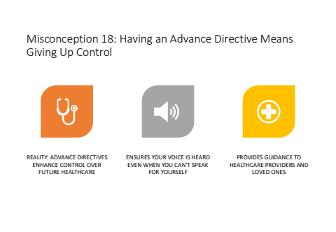 Misconception 18: Having an Advance Directive Means Giving Up ControlREALITY: ADVANCE DIRECTIVES ENHANCE CONTROL OVER FUTURE HEALTHCAREENSURES YOUR VOICE IS HEARD EVEN WHEN YOU CAN'T SPEAK FOR YOURSELFPROVIDES GUIDANCE TO HEALTHCARE PROVIDERS AND LOVED ONES
