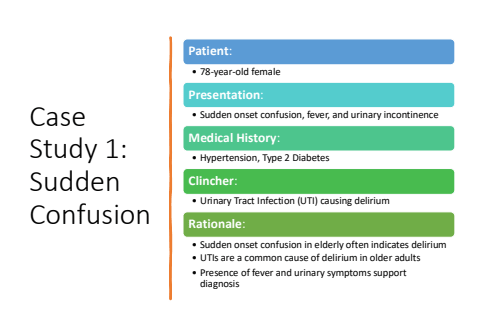 Case Study 1: Sudden ConfusionPatient:%u2022 78-year-old femalePresentation:%u2022 Sudden onset confusion, fever, and urinary incontinenceMedical History:%u2022 Hypertension, Type 2 DiabetesClincher:%u2022 Urinary Tract Infection (UTI) causing deliriumRationale:%u2022 Sudden onset confusion in elderly often indicates delirium%u2022 UTIs are a common cause of delirium in older adults%u2022 Presence of fever and urinary symptoms support diagnosis