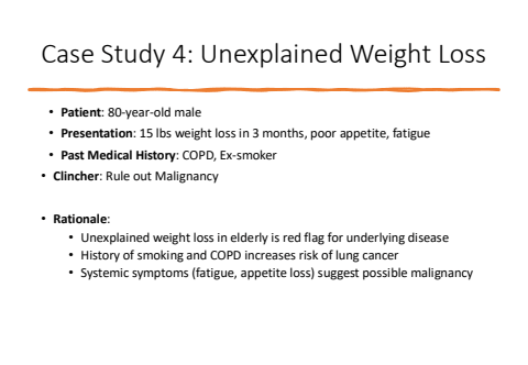 Case Study 4: Unexplained Weight Loss%u2022 Patient: 80-year-old male%u2022 Presentation: 15 lbs weight loss in 3 months, poor appetite, fatigue%u2022 Past Medical History: COPD, Ex-smoker%u2022 Clincher: Rule out Malignancy%u2022 Rationale:%u2022 Unexplained weight loss in elderly is red flag for underlying disease%u2022 History of smoking and COPD increases risk of lung cancer%u2022 Systemic symptoms (fatigue, appetite loss) suggest possible malignancy