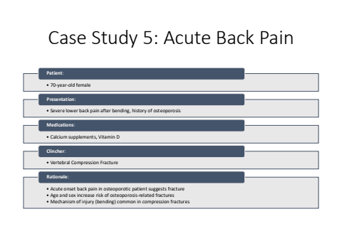 Case Study 5: Acute Back Pain%u2022 70-year-old femalePatient:%u2022 Severe lower back pain after bending, history of osteoporosisPresentation:%u2022 Calcium supplements, Vitamin DMedications:%u2022 Vertebral Compression FractureClincher:%u2022 Acute onset back pain in osteoporotic patient suggests fracture%u2022 Age and sex increase risk of osteoporosis-related fractures%u2022 Mechanism of injury (bending) common in compression fracturesRationale: