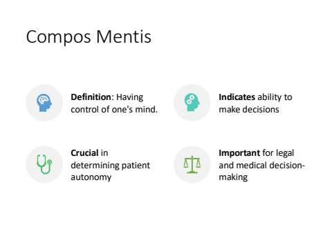 Compos MentisDefinition: Having control of one's mind.Indicates ability to make decisionsCrucial in determining patient autonomyImportant for legal and medical decisionmaking