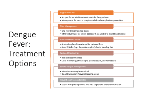 Dengue Fever: Treatment Options%u2022 No specific antiviral treatment exists for Dengue fever%u2022 Management focuses on symptom relief and complication preventionSupportive Care:%u2022 Oral rehydration for mild cases%u2022 Intravenous fluids for severe cases or those unable to tolerate oral intakeFluid Management:%u2022 Acetaminophen/Paracetamol for pain and fever%u2022 Avoid NSAIDs (e.g., ibuprofen, aspirin) due to bleeding riskPain and Fever Control:%u2022 Bed rest recommended%u2022 Close monitoring of vital signs, platelet count, and hematocritRest and Monitoring:%u2022 Intensive care may be required%u2022 Blood transfusion if severe bleeding occursSevere Dengue Management:%u2022 Use of mosquito repellents and nets to prevent further transmissionPrevention of Mosquito Bites: