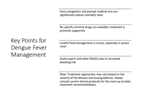 Key Points for Dengue Fever ManagementEarly recognition and prompt medical care can significantly reduce mortality ratesNo specific antiviral drugs are available; treatment is primarily supportiveCareful fluid management is crucial, especially in severe casesAvoid aspirin and other NSAIDs due to increased bleeding riskNote: Treatment approaches may vary based on the severity of the disease and local guidelines. Always consult current clinical protocols for the most up-to-date treatment recommendations.