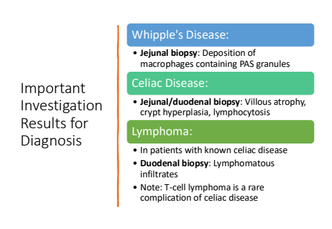 Important Investigation Results for DiagnosisWhipple's Disease:%u2022 Jejunal biopsy: Deposition of macrophages containing PAS granulesCeliac Disease:%u2022 Jejunal/duodenal biopsy: Villous atrophy, crypt hyperplasia, lymphocytosisLymphoma:%u2022 In patients with known celiac disease%u2022 Duodenal biopsy: Lymphomatous infiltrates%u2022 Note: T-cell lymphoma is a rare complication of celiac disease