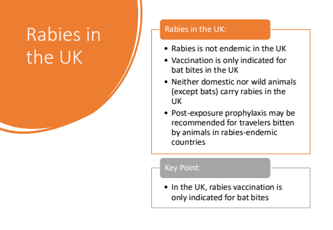 Rabies in the UK %u2022 Rabies is not endemic in the UK%u2022 Vaccination is only indicated for bat bites in the UK%u2022 Neither domestic nor wild animals (except bats) carry rabies in the UK%u2022 Post-exposure prophylaxis may be recommended for travelers bitten by animals in rabies-endemic countriesRabies in the UK:%u2022 In the UK, rabies vaccination is only indicated for bat bitesKey Point: