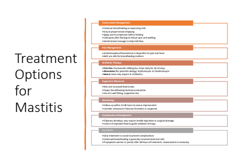 Treatment Options for Mastitis%u2022Continue breastfeeding or expressing milk%u2022Ensure proper breast emptying%u2022Apply warm compresses before feeding%u2022Cold packs after feeding to reduce pain and swelling%u2022Gentle breast massage to help milk flowConservative Management:%u2022Acetaminophen/Paracetamol or Ibuprofen for pain and fever%u2022Both are safe for breastfeeding mothersPain Management:%u2022First-line: Flucloxacillin 500mg four times daily for 10-14 days%u2022Alternative (for penicillin allergy): Erythromycin or Clarithromycin%u2022Severe cases may require IV antibioticsAntibiotic Therapy:%u2022Rest and increased fluid intake%u2022Proper breastfeeding technique education%u2022Use of a well-fitting, supportive braSupportive Measures:%u2022Follow-up within 24-48 hours to assess improvement%u2022Consider ultrasound if abscess formation is suspectedMonitoring:%u2022If abscess develops, may require needle aspiration or surgical drainage%u2022Culture of aspirated fluid to guide antibiotic therapyComplications Management:%u2022Early treatment is crucial to prevent complications%u2022Continued breastfeeding is generally recommended and safe%u2022If symptoms worsen or persist after 48 hours of treatment, reassessment is necessaryKey Points: