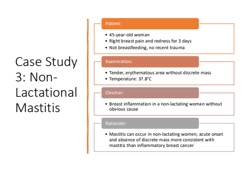 Case Study 3: NonLactational Mastitis%u2022 45-year-old woman%u2022 Right breast pain and redness for 3 days%u2022 Not breastfeeding, no recent traumaPatient:%u2022 Tender, erythematous area without discrete mass%u2022 Temperature: 37.8%u00b0CExamination:%u2022 Breast inflammation in a non-lactating woman without obvious causeClincher:%u2022 Mastitis can occur in non-lactating women; acute onset and absence of discrete mass more consistent with mastitis than inflammatory breast cancerRationale: