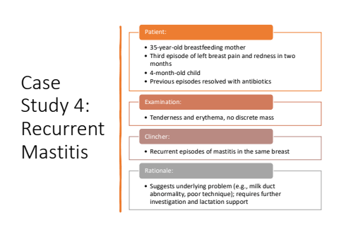 Case Study 4: Recurrent Mastitis%u2022 35-year-old breastfeeding mother%u2022 Third episode of left breast pain and redness in two months%u2022 4-month-old child%u2022 Previous episodes resolved with antibioticsPatient:%u2022 Tenderness and erythema, no discrete massExamination:%u2022 Recurrent episodes of mastitis in the same breastClincher:%u2022 Suggests underlying problem (e.g., milk duct abnormality, poor technique); requires further investigation and lactation supportRationale:
