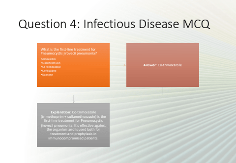 Question 4: Infectious Disease MCQWhat is the first-line treatment for Pneumocystis jirovecii pneumonia?%u2022Amoxicillin%u2022Clarithromycin%u2022Co-trimoxazole%u2022Ceftriaxone%u2022DapsoneAnswer: Co-trimoxazoleExplanation: Co-trimoxazole (trimethoprim + sulfamethoxazole) is the first-line treatment for Pneumocystis jirovecii pneumonia. It's effective against the organism and is used both for treatment and prophylaxis in immunocompromised patients.