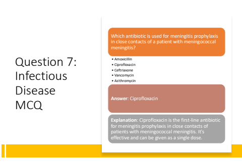 Question 7: Infectious Disease MCQWhich antibiotic is used for meningitis prophylaxis in close contacts of a patient with meningococcal meningitis?%u2022 Amoxicillin%u2022 Ciprofloxacin%u2022 Ceftriaxone%u2022 Vancomycin%u2022 AzithromycinAnswer: CiprofloxacinExplanation: Ciprofloxacin is the first-line antibiotic for meningitis prophylaxis in close contacts of patients with meningococcal meningitis. It's effective and can be given as a single dose.