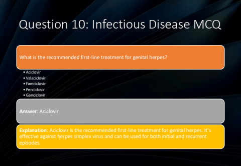 Question 10: Infectious Disease MCQWhat is the recommended first-line treatment for genital herpes?%u2022Aciclovir%u2022Valaciclovir%u2022 Famciclovir%u2022 Penciclovir%u2022GanciclovirAnswer: AciclovirExplanation: Aciclovir is the recommended first-line treatment for genital herpes. It's effective against herpes simplex virus and can be used for both initial and recurrent episodes.
