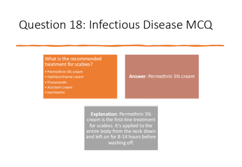 Question 18: Infectious Disease MCQWhat is the recommended treatment for scabies?%u2022 Permethrin 5% cream%u2022 Hydrocortisone cream%u2022 Fluconazole%u2022 Aciclovir cream%u2022 IvermectinAnswer: Permethrin 5% creamExplanation: Permethrin 5% cream is the first-line treatment for scabies. It's applied to the entire body from the neck down and left on for 8-14 hours before washing off.