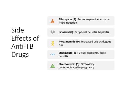 Side Effects of Anti-TB DrugsRifampicin (R): Red-orange urine, enzyme P450 inductionIsoniazid (I): Peripheral neuritis, hepatitisPyrazinamide (P): Increased uric acid, gout riskEthambutol (E): Visual problems, optic neuritisStreptomycin (S): Ototoxicity, contraindicated in pregnancy