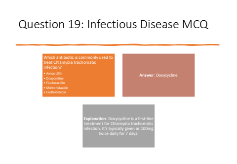 Question 19: Infectious Disease MCQWhich antibiotic is commonly used to treat Chlamydia trachomatis infection?%u2022 Amoxicillin%u2022 Doxycycline%u2022 Flucloxacillin%u2022 Metronidazole%u2022 ErythromycinAnswer: DoxycyclineExplanation: Doxycycline is a first-line treatment for Chlamydia trachomatis infection. It's typically given as 100mg twice daily for 7 days.