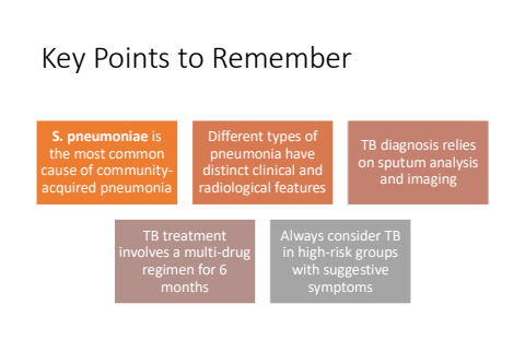 Key Points to RememberS. pneumoniae is the most common cause of communityacquired pneumoniaDifferent types of pneumonia have distinct clinical and radiological featuresTB diagnosis relies on sputum analysis and imagingTB treatment involves a multi-drug regimen for 6 monthsAlways consider TB in high-risk groups with suggestive symptoms