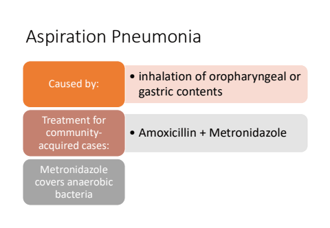 Aspiration Pneumonia%u2022 inhalation of oropharyngeal or gastric contents Caused by:%u2022 Amoxicillin + MetronidazoleTreatment for communityacquired cases:Metronidazole covers anaerobic bacteria