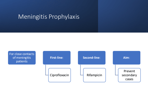 Meningitis ProphylaxisFor close contacts of meningitis patientsFirst-line:CiprofloxacinSecond-line:RifampicinAim:Prevent secondary cases
