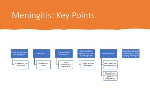 Meningitis: Key PointsEmpiric treatment for >60 years:IV ceftriaxone + IV amoxicillin<60 years:IV ceftriaxone aloneGram-positive diplococci:Suspect Streptococcus pneumoniaeGram-negative diplococci or nonblanching rash:Suspect Neisseria meningitidisComplications:Otitis media can lead to meningitisMeningitis can cause hearing loss (delayed complication)Important: Arrange a hearing test after treating meningitis