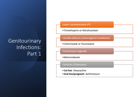 Genitourinary Infections: Part 1%u2022Trimethoprim or NitrofurantoinLower uncomplicated UTI:%u2022Clotrimazole or FluconazoleCandida albicans (Vulvovaginal Candidiasis):%u2022MetronidazoleTrichomonas vaginalis:%u20221st line: Doxycycline%u20222nd line/pregnant: AzithromycinCervicitis (Chlamydia):