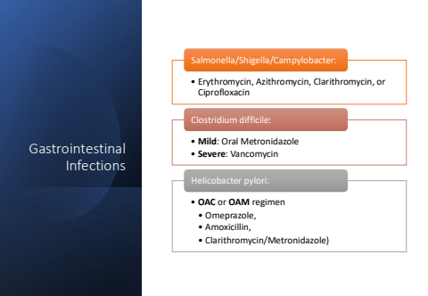 Gastrointestinal Infections%u2022 Erythromycin, Azithromycin, Clarithromycin, or CiprofloxacinSalmonella/Shigella/Campylobacter:%u2022 Mild: Oral Metronidazole%u2022 Severe: VancomycinClostridium difficile:%u2022 OAC or OAM regimen%u2022 Omeprazole,%u2022 Amoxicillin,%u2022 Clarithromycin/Metronidazole)Helicobacter pylori: