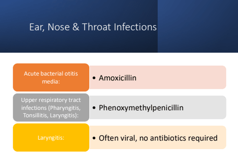 Ear, Nose & Throat Infections%u2022 Amoxicillin Acute bacterial otitis media:%u2022 PhenoxymethylpenicillinUpper respiratory tract infections (Pharyngitis, Tonsillitis, Laryngitis):Laryngitis: %u2022 Often viral, no antibiotics required