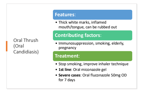 Oral Thrush (Oral Candidiasis)Features:%u2022 Thick white marks, inflamed mouth/tongue, can be rubbed outContributing factors:%u2022 Immunosuppression, smoking, elderly, pregnancyTreatment:%u2022 Stop smoking, improve inhaler technique%u2022 1st line: Oral miconazole gel%u2022 Severe cases: Oral fluconazole 50mg OD for 7 days