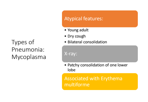 Types of Pneumonia: MycoplasmaAtypical features:%u2022 Young adult%u2022 Dry cough%u2022 Bilateral consolidationX-ray:%u2022 Patchy consolidation of one lower lobeAssociated with Erythema multiforme