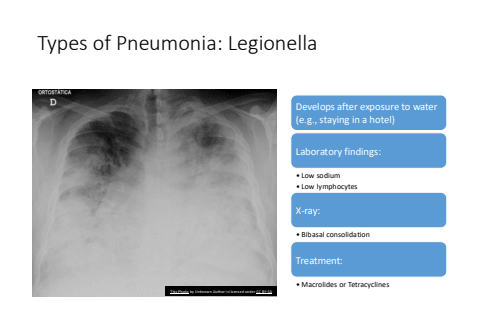 Types of Pneumonia: LegionellaDevelops after exposure to water (e.g., staying in a hotel)Laboratory findings:%u2022 Low sodium%u2022 Low lymphocytesX-ray:%u2022 Bibasal consolidationTreatment:%u2022 Macrolides or TetracyclinesThis Photo by Unknown Author is licensed under CC BY-SA