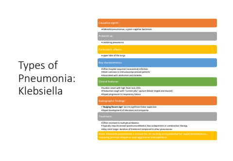 Types of Pneumonia: KlebsiellaCausative agent:%u2022Klebsiella pneumoniae, a gram-negative bacteriumPresents as:%u2022cavitating pneumoniaParticularly affects:%u2022upper lobe of the lungsKey characteristics:%u2022Often hospital-acquired (nosocomial) infection%u2022More common in immunocompromised patients%u2022Associated with alcoholism and diabetesClinical features:%u2022Sudden onset with high fever and chills%u2022Productive cough with \%u2022Rapid progression to respiratory failureRadiographic findings:%u2022\ fissure sign\%u2022Rapid development of abscesses and empyemaTreatment:%u2022Often resistant to multiple antibiotics%u2022Typically requires broad-spectrum antibiotics like carbapenems or combination therapy%u2022May need longer duration of treatment compared to other pneumoniasNote: Klebsiella pneumonia is known for its severity and potential for rapid deterioration, requiring prompt diagnosis and aggressive management.