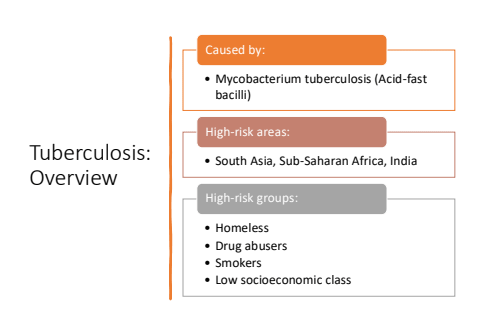 Tuberculosis: Overview%u2022 Mycobacterium tuberculosis (Acid-fast bacilli)Caused by:%u2022 South Asia, Sub-Saharan Africa, IndiaHigh-risk areas:%u2022 Homeless%u2022 Drug abusers%u2022 Smokers%u2022 Low socioeconomic classHigh-risk groups: