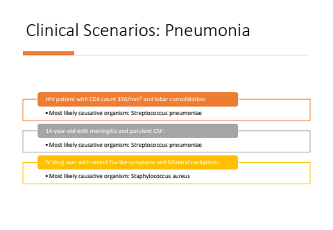 Clinical Scenarios: Pneumonia%u2022Most likely causative organism: Streptococcus pneumoniaeHIV patient with CD4 count 350/mm%u00b3 and lobar consolidation:%u2022Most likely causative organism: Streptococcus pneumoniae14-year-old with meningitis and purulent CSF:%u2022Most likely causative organism: Staphylococcus aureusIV drug user with recent flu-like symptoms and bilateral cavitations: