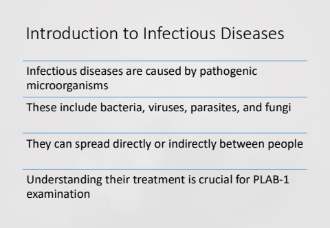 Introduction to Infectious DiseasesInfectious diseases are caused by pathogenic microorganismsThese include bacteria, viruses, parasites, and fungiThey can spread directly or indirectly between peopleUnderstanding their treatment is crucial for PLAB-1 examination