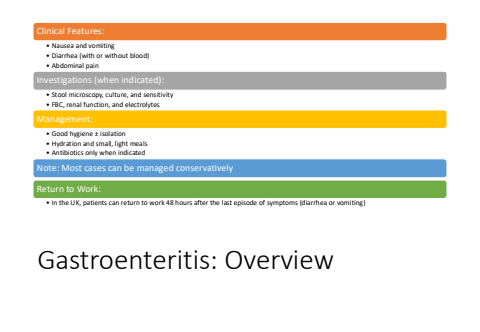 Gastroenteritis: OverviewClinical Features:%u2022 Nausea and vomiting%u2022 Diarrhea (with or without blood)%u2022 Abdominal painInvestigations (when indicated):%u2022 Stool microscopy, culture, and sensitivity%u2022 FBC, renal function, and electrolytesManagement:%u2022 Good hygiene %u00b1 isolation%u2022 Hydration and small, light meals%u2022 Antibiotics only when indicatedNote: Most cases can be managed conservativelyReturn to Work:%u2022 In the UK, patients can return to work 48 hours after the last episode of symptoms (diarrhea or vomiting)
