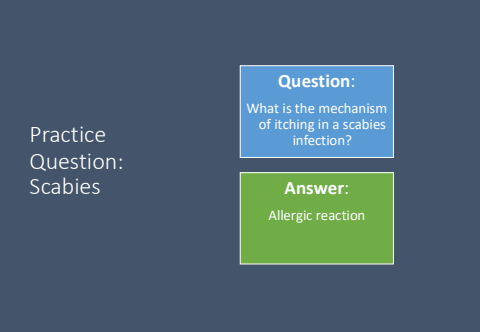 Practice Question: ScabiesQuestion:What is the mechanism of itching in a scabies infection?Answer:Allergic reaction