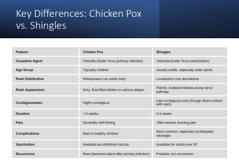 Key Differences: Chicken Pox vs. ShinglesFeature Chicken Pox ShinglesCausative Agent Varicella-Zoster Virus (primary infection) Varicella-Zoster Virus (reactivation)Age Group Typically children Usually adults, especially older adultsRash Distribution Widespread over entire body Localized to one dermatomeRash Appearance Itchy, fluid-filled blisters in various stages Painful, clustered blisters along nerve pathwayContagiousness Highly contagious Less contagious (only through direct contact with rash)Duration 1-2 weeks 2-4 weeksPain Generally mild itching Often severe, burning painComplications Rare in healthy children More common, especially postherpetic neuralgiaVaccination Available as childhood vaccine Available for adults over 50Recurrence Rare (becomes latent after primary infection) Possible, but uncommon