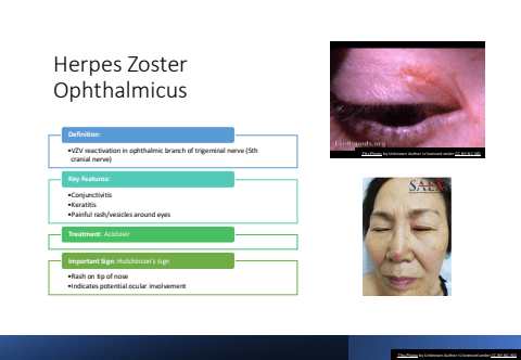 Herpes Zoster Ophthalmicus%u2022VZV reactivation in ophthalmic branch of trigeminal nerve (5th cranial nerve)Definition:%u2022Conjunctivitis%u2022Keratitis%u2022Painful rash/vesicles around eyesKey Features:Treatment: Aciclovir%u2022Rash on tip of nose%u2022Indicates potential ocular involvementImportant Sign: Hutchinson's signThis Photo by Unknown Author is licensed under CC BY-NC-NDThis Photo by Unknown Author is licensed under CC BY-NC-ND