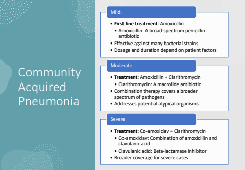 Community Acquired Pneumonia%u2022 First-line treatment: Amoxicillin%u2022 Amoxicillin: A broad-spectrum penicillin antibiotic%u2022 Effective against many bacterial strains%u2022 Dosage and duration depend on patient factorsMild:%u2022 Treatment: Amoxicillin + Clarithromycin%u2022 Clarithromycin: A macrolide antibiotic%u2022 Combination therapy covers a broader spectrum of pathogens%u2022 Addresses potential atypical organismsModerate%u2022 Treatment: Co-amoxiclav + Clarithromycin%u2022 Co-amoxiclav: Combination of amoxicillin and clavulanic acid%u2022 Clavulanic acid: Beta-lactamase inhibitor%u2022 Broader coverage for severe casesSevere